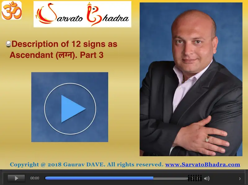 - Description of each sign as Ascendant (लग्न): analysis of the symbol (चिह्न), guna (गुण), tatwa (तत्व), varna (वर्ण ) etc of each sign and Ascendant lord (लग्नेश).